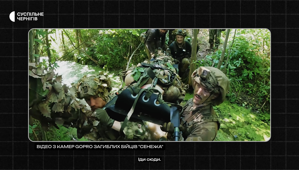 Тут упоралися. По-перше, для зручності сприйняття годна відео розбита на окремі компактні розділи, що сприяє лінійності оповіді. По-друге, сама оповідь пропорційно, приблизно по 20 хвилин на акт, поділена на загальну, емоційну та героїчну частини. Загальна — знайомство глядачів з антигероями. Тобто, диверсантами «Сенежу», «елітою еліт», про яких, за словами Надії Мартишко, навіть всезнайко інтернет видає дуже мало інформації. Так верстається будь-який епічний сценарій. Спершу об`ємно показується ворог і вчинене ним безкарне зло — й автори не жаліють глядача, стримано й чесно переповідаючи про болючі втрати з нашого боку. Далі зосереджуються на історії цивільної жертви, це емоційна частина: детальна оповідь життя та загибелі волонтера Максима Андросенка.