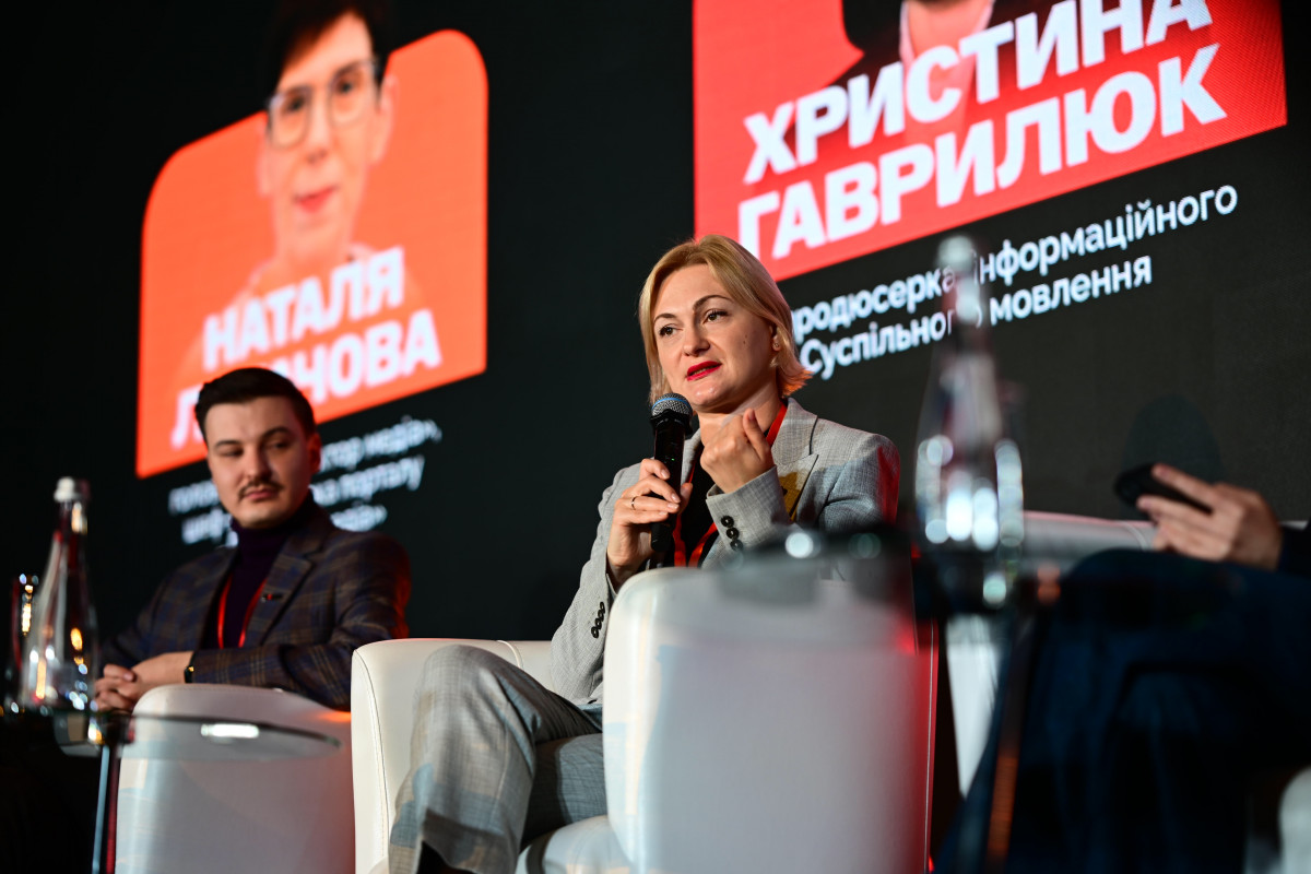 Христина Гаврилюк відповіла, що не вважає позиції Суспільного наразі ідеальними. «Нам треба дуже багато працювати, аби бути більш видимими в YouTube, TikTok чи інших платформах», — сказала вона. За її словами, це складний виклик: як працювати в умовах обмежень, які в довгостроковому вимірі мають принести довіру, і водночас залучити аудиторію тут і зараз, отримувати хороші чисельні показники.