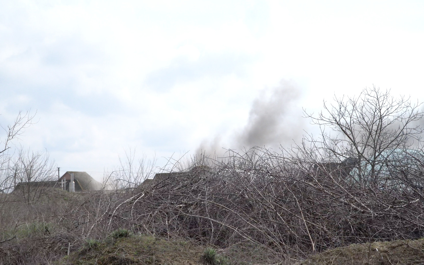 Фото: Дим після другого влучання міни біля будинків у селі Капулівка / Роман Михальчук