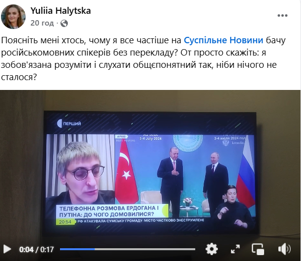 У своєму пості на фейсбуці журналістка звернула увагу на те, що спікер в ефірі Суспільного говорить російською мовою без перекладу українською.