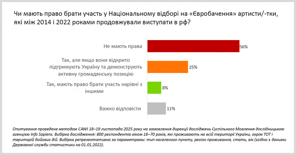 8% українців відповіли, що артисти, які виступали в Росії після 2014 року, мають право брати участь у нацвідборі нарівні з іншими. Ще 11% сказали, що їм важко відповісти на це запитання.