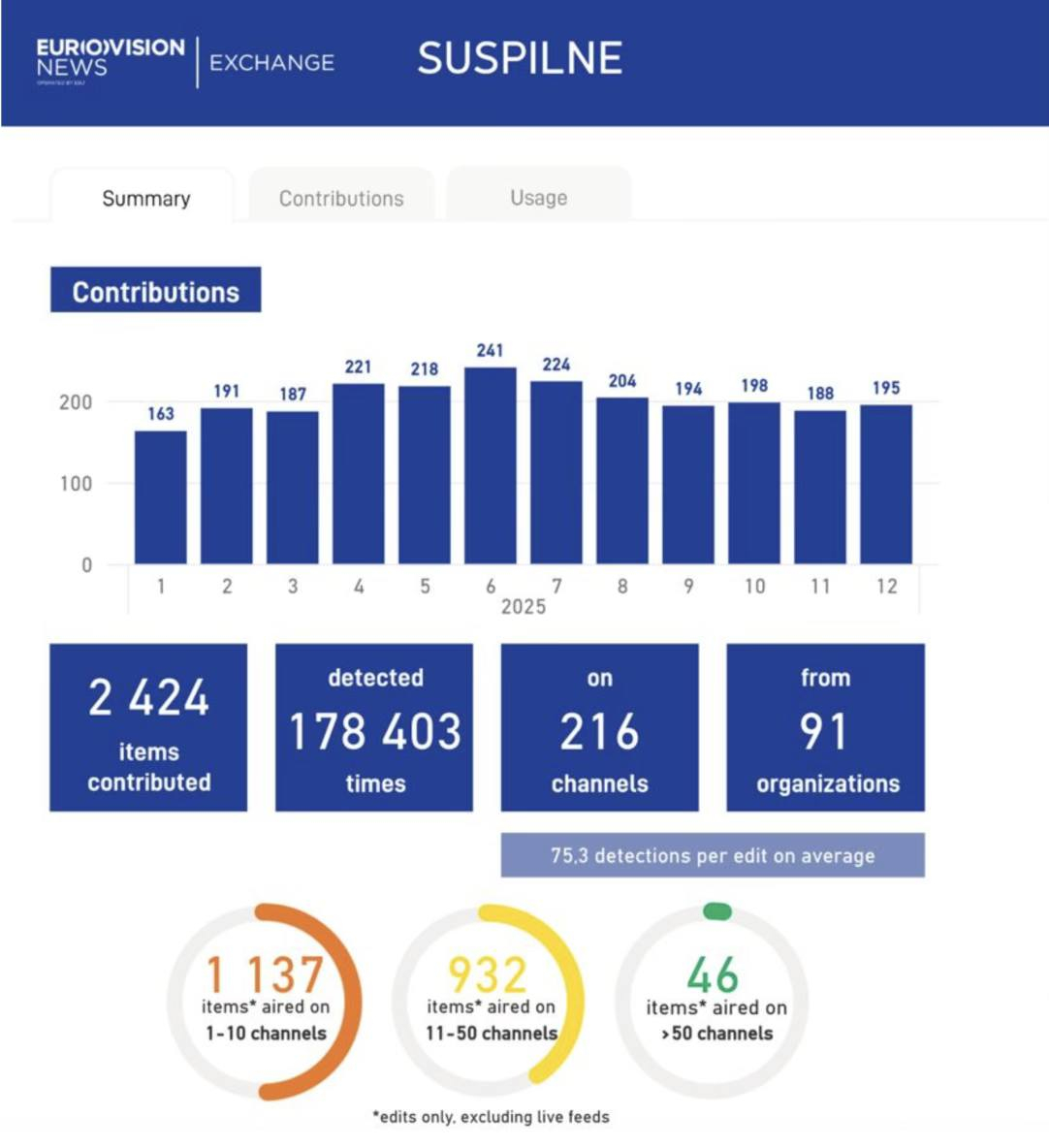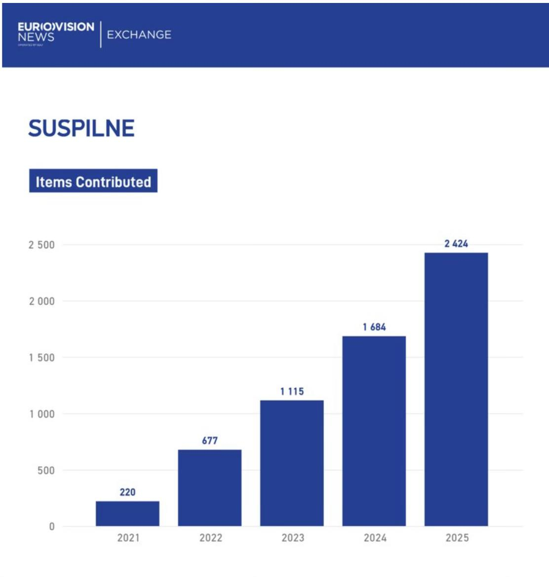Європейська мовна спілка за 2024 рік опублікувала 1684 матеріали Суспільного. Новинні відеоматеріали Суспільного, розміщені для обміну з європейськими мовниками, отримали понад 120 тисяч показів у телевізійному ефірі, а також понад 3 тисячі публікацій на диджитал-платформах.